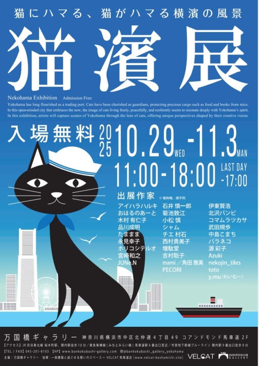 昔から貿易港として栄えた横浜。猫はネズミから大切な積み荷の食料や書物を守る「番人」として愛されてきました。開放的で新しいものが好きな横濱に自由で平和で逞しく生きる猫の姿はどこかリンクします。本展覧会では作家の視点で猫を通して「横濱の情景」を映し出します。 ~万国橋ギャラリーのインスタより~
